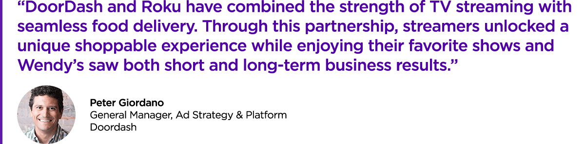 Additionally, shoppable ads have made dinner and a movie easier than ever. Through a Roku-DoorDash integration, a Wendy's campaign on Roku offered $5 off orders of $15 or more. Roku viewers who clicked on the ad received a text message with a deep link to the Wendy’s storefront in the DoorDash app.