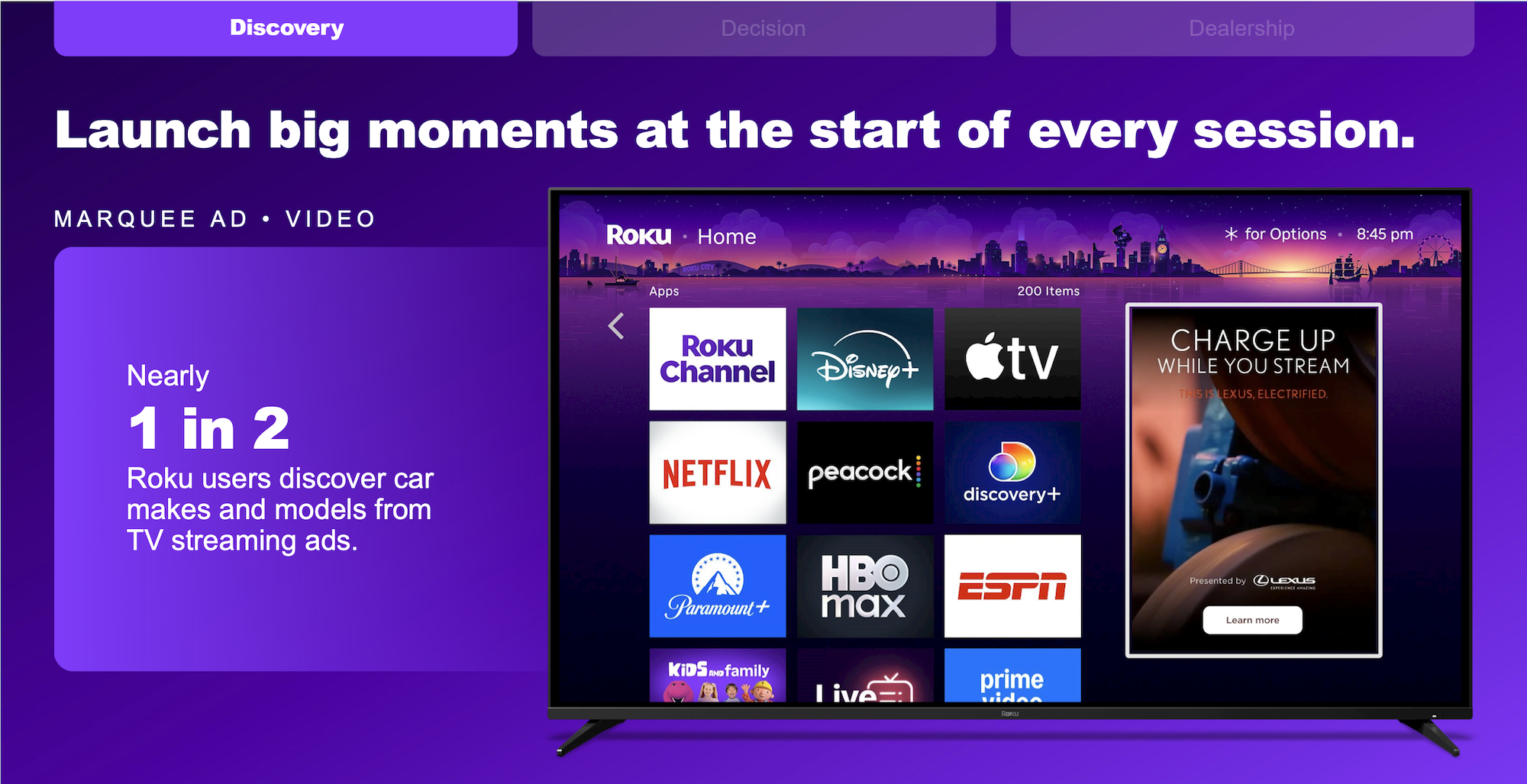 Roku is well positioned to solve this discovery problem for streamers and auto brands alike. Nearly 50% of all streaming hours happen on our platform⁴, and Roku’s Home Screen is the starting point for our streamers’ entertainment journeys. Advertising on the Home Screen gives brands a powerful front-door placement to showcase new models and seasonal dealership events before streamers even start watching.