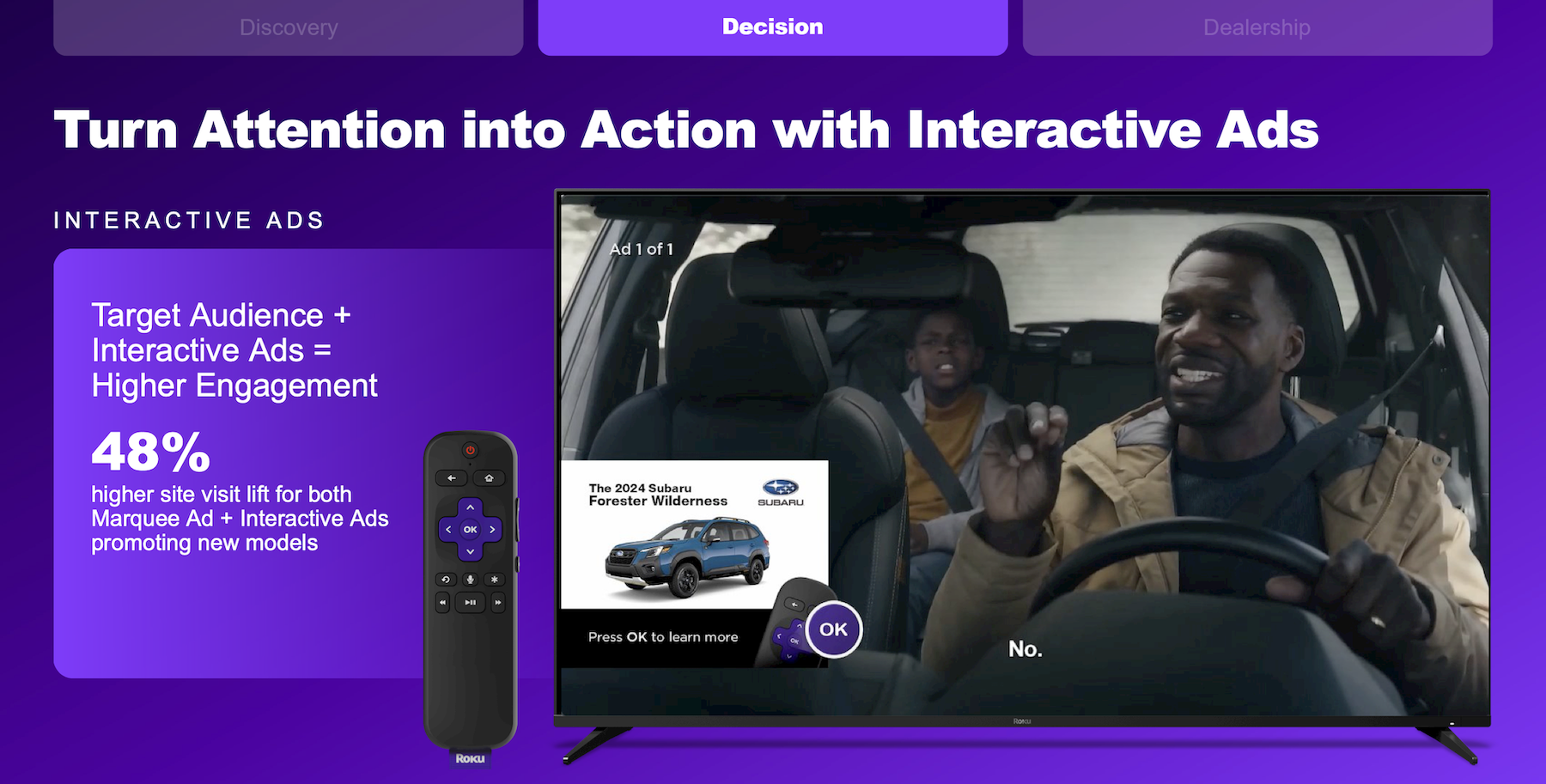 By encouraging viewers to drill down and learn about new models using their Roku remote, auto makers increase the time spent with their brands – and the likelihood of a dealer visit.