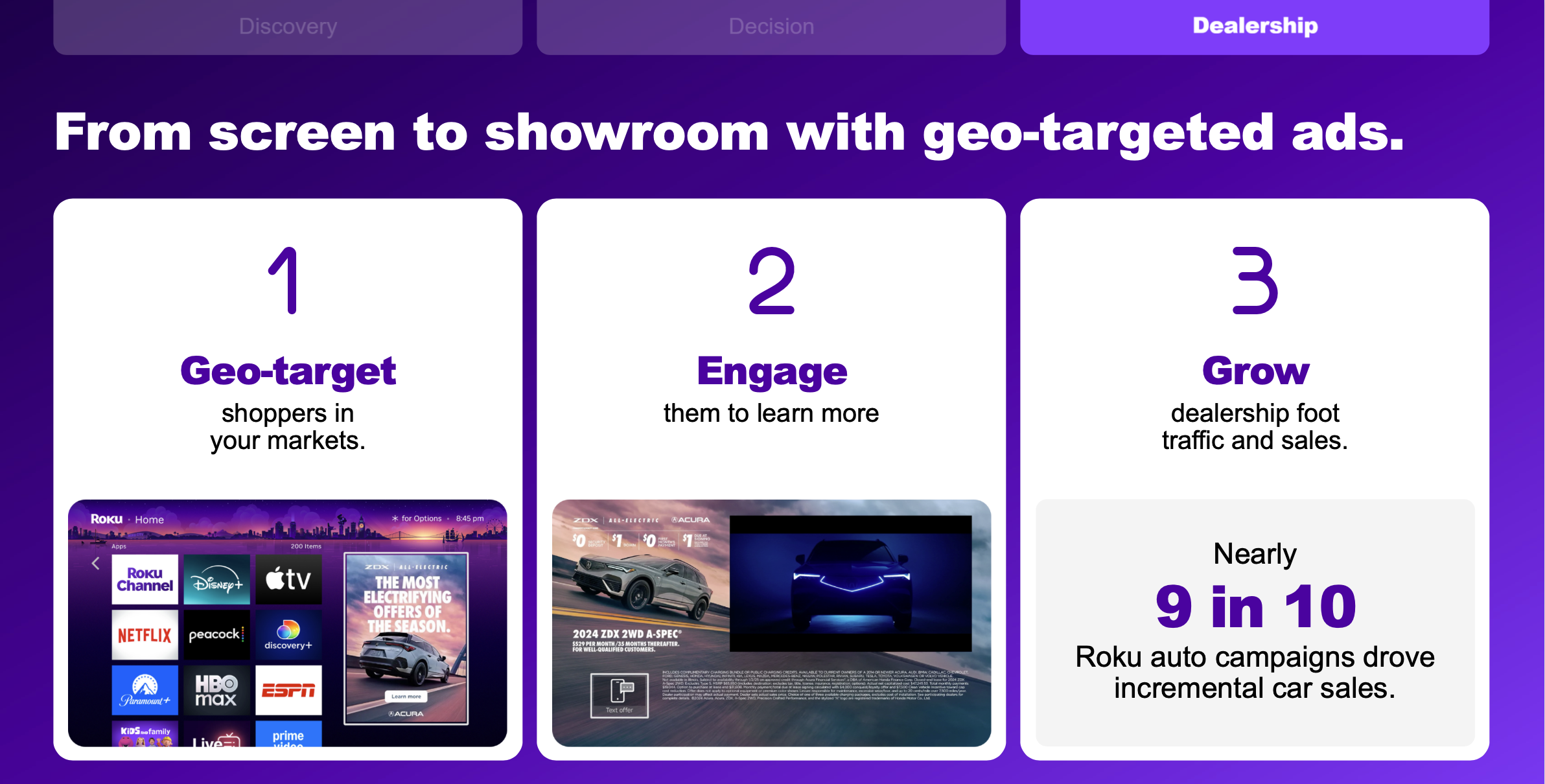 National reach is key for brand awareness, but dealership activation is what drives sales. That’s why Roku offers geo-targeted ad solutions that help brands guide viewers to their nearest dealership, using tools like text-to-learn prompts, local landing pages and more.