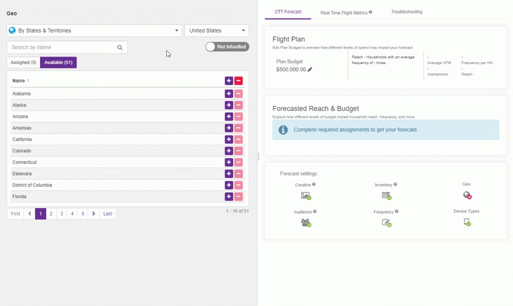 Before you start selecting your audiences In OneView, you'll set your budget and your campaign duration. With our OTT forecaster tool, you’ll be able to analyze the impact of your campaign on your audience by the numbers, with a visualization of your estimated reach, frequency, and average CPM. This can help you understand the size of your audience and how to set a budget that makes sense for your campaign goals.