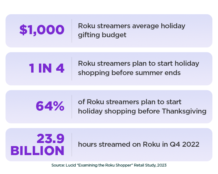 Each year, marketers fret about how to get consumers to choose their brand for their holiday shopping needs. A critical strategy is to get your message out early. Almost one-quarter of Roku users plan to start holiday shopping before summer ends and 64% plan to start before Thanksgiving.² Make a bid for their attention in Q3 to influence holiday purchases throughout the shopping season. If you’re only prioritizing Black Friday through Christmas Day, you’re likely missing out.