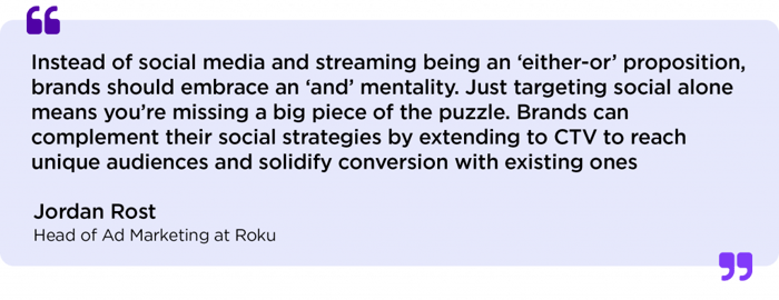 Social media and streaming are best used together as part of a holistic, omnichannel approach to advertising. Advertisers should picture the consumer journey as a waving line that journeys between social media ads, streaming ads and placements in other channels. Leaving out either social or streaming strategies from a media plan means you’re missing a critical piece of the consumer’s daily experience.