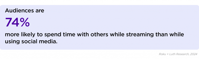 When streamers fire up their TVs, they’re in very different mindsets than social media users reaching for their phones. Majority of streamers report being calm and engaged while streaming TV.³ And ironically, streaming is considered more social than social media. Audiences are 74% more likely to spend time with others while streaming than while using social media.⁴