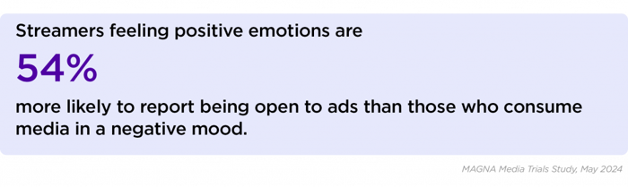 What’s the significance of this positive mindset while streaming? Well, research shows that positive moods lead to more openness and receptivity around advertising. Streamers feeling positive emotions are 54% more likely to report being open to ads than those who consume media in a negative mood.⁷ Given the strong, positive associations with streaming TV, advertisers should capitalize on opportunities to reach audiences when they’re feeling relaxed and engaged –– and therefore more receptive to advertising.
