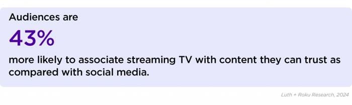 Consumers may spend near-equal time streaming and scrolling, but the content they find can be wildly different. Audiences depend on streaming for premiere, high quality content,⁸ and are 43% more likely to associate streaming TV with content they can trust as compared with social media.⁹