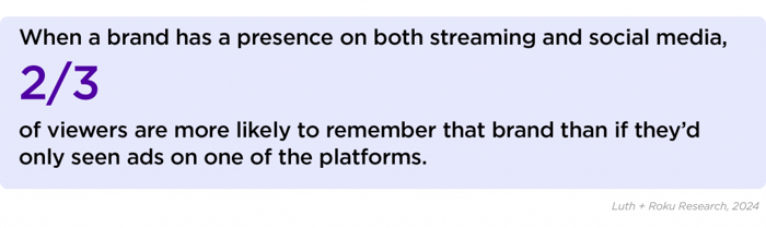 When a brand has a presence on both streaming and social media, two-thirds of viewers are more likely to remember that brand than if they’d only seen ads on one of the platforms.