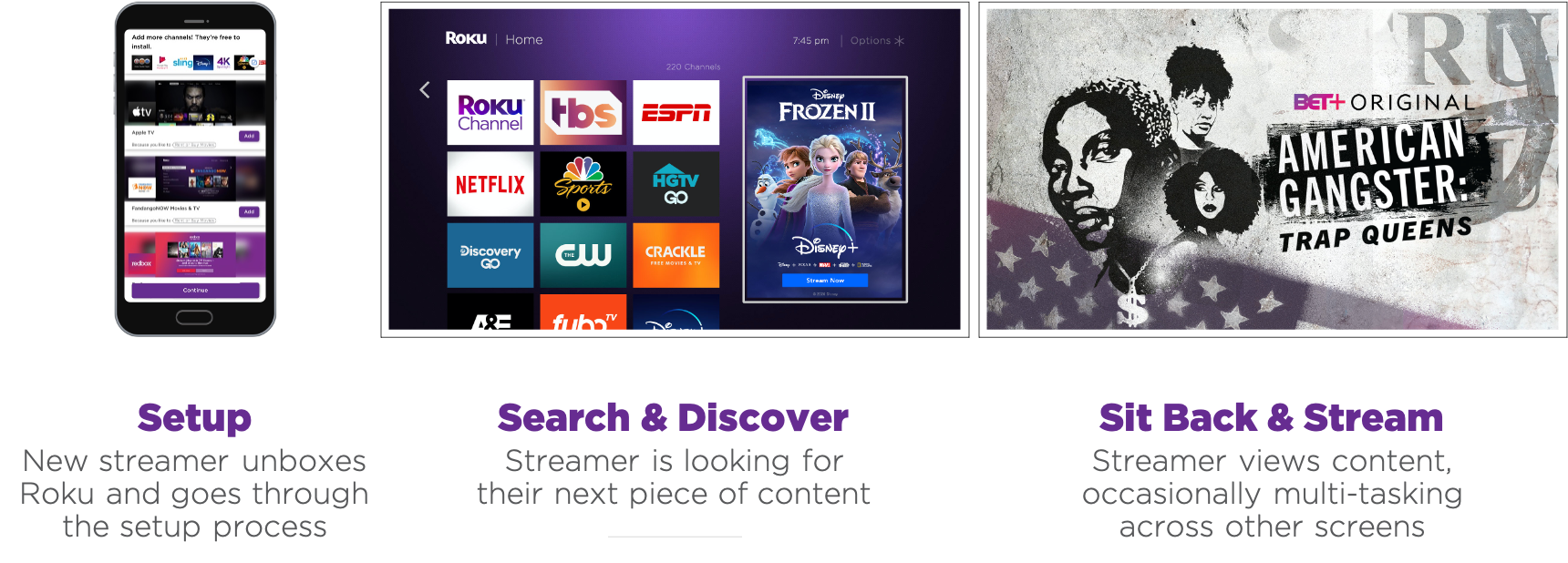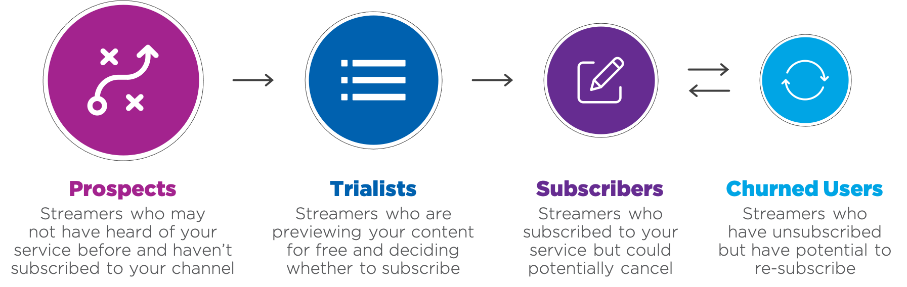 We categorize streamers by four different personas: prospects, trialists, subscribers, and churned users. Each requires a touchpoint to drive interest in your streaming channel. There are three key streaming moments during a streamer’s journey: setup, search & discover, and sit back & stream.