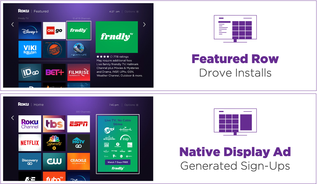 When Frndly TV wanted to connect with new viewers looking for family-friendly content, the team worked with Roku to connect with audiences based on what viewers had already been watching and who was most likely to sign up. Those users were served with two different ad experiences: a featured tile and native display ads.