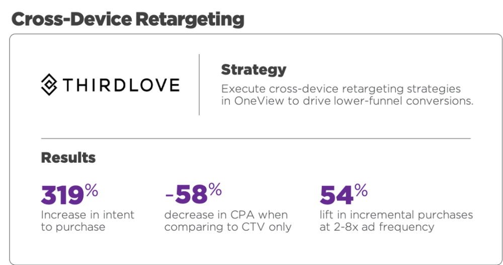 Retargeting helps reinforce your messaging and drive streamers to take action. When DTC e-commerce company ThirdLove wanted to reach streamers, the team executed a cross-device campaign that went beyond the big screen, retargeting users after they had seen the streaming ad.